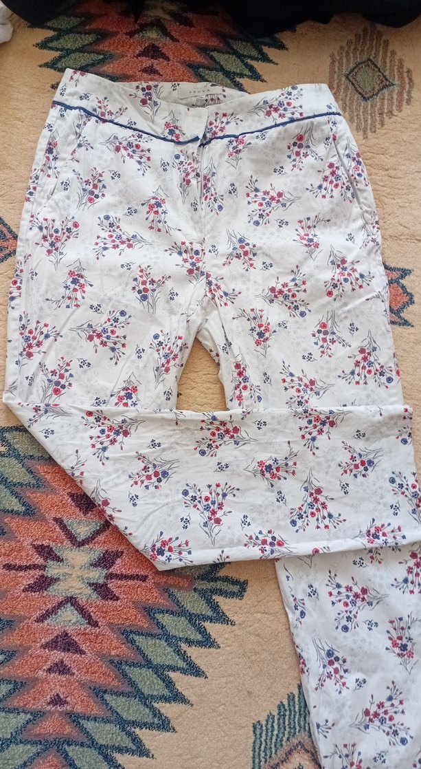 Pruva marka Pamuklu, midi boy, bol kesim, pastel çiçek desenli ve düğmeli ön kısma sahip bohem tarz pantolon .