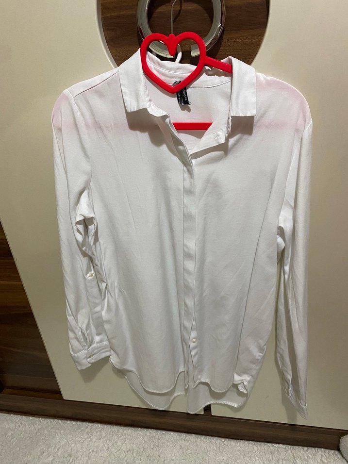 Kadınlar için beyaz pamuklu gömlek, düğmeli ve yakalıdır. Uzun kollu, normal kesim ve minimalist günlük stildir.