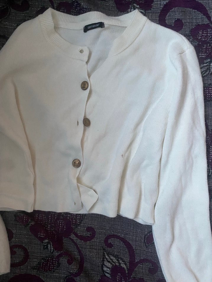 Uzun kollu, yuvarlak yakalı ve pamuklu dokusuyla beyaz, düğmeli, rahat kesim midi uzunlukta kadın hırkası. Günlük sokak stili için uygundur.