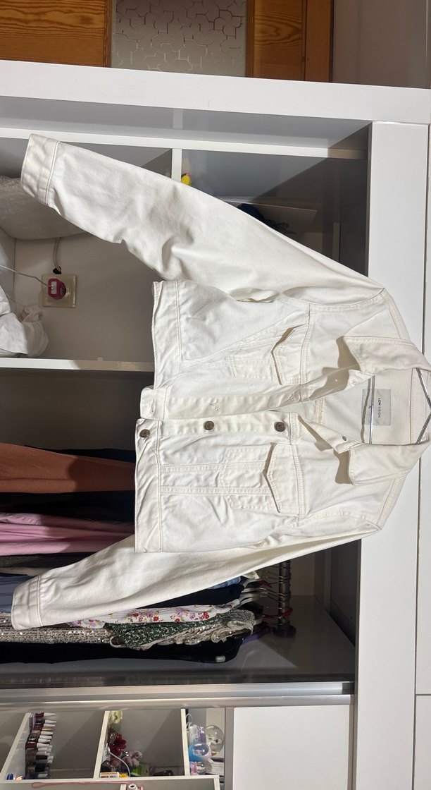 Pamuklu, düğmeli, uzun kollu, beyaz kot ceket. Notlu yaka ve normal boy ile günlük rahat sokak stili sunar. hiç giymedim sadece yıkadım.