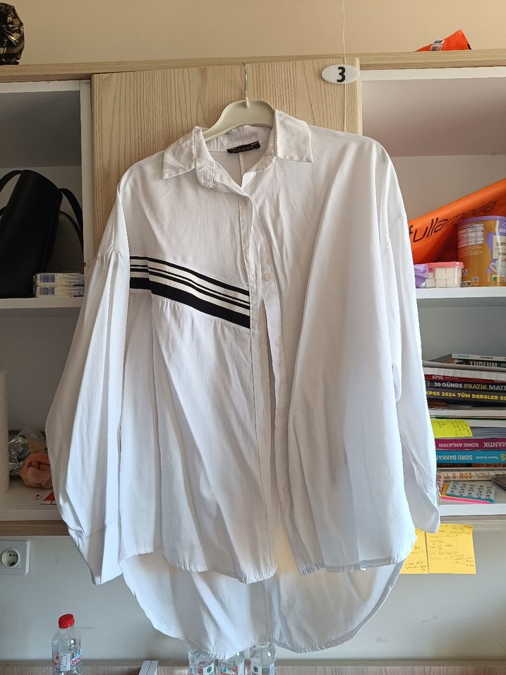 Kadın beyaz pamuklu gömlek, düğmeli ve uzun kolludur. Oversize kesimi, yakalı ve hafif siyah çizgi detayıyla günlük sokak stiline uygundur.