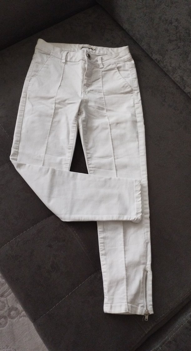 Kadınlar için beyaz pamuklu kumaş pantolon, normal kesim ve midi boy. Fermuarlı detaylarla günlük kullanıma uygun rahat tasarım. ölçüleri fotoğraflarda mevcut 8/ 10 yas kız çocuklarina da olur