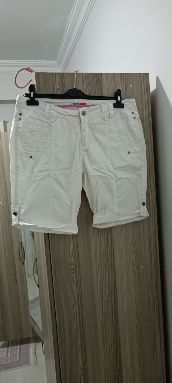 Kadın beyaz pamuklu bermuda şort, kemerli ve bol kesimdir. Rahat ve günlük dış mekan kullanımı için uygundur.