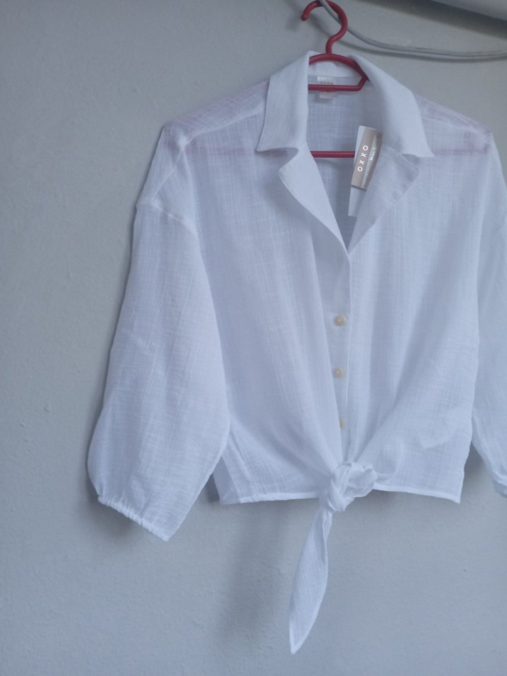 Pamuklu, beyaz, kısa kollu, bol kesim gömlek. Yaka tipi kayık yaka, düğmeli ve kısa boyda, ön kısmı bağlamalıdır. boy 50 iki kol arası 47