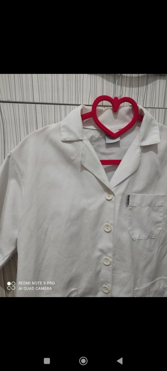 Beyaz pamuklu, yakalı ve düğmeli kısa kollu önlük.Doktor önlüğü