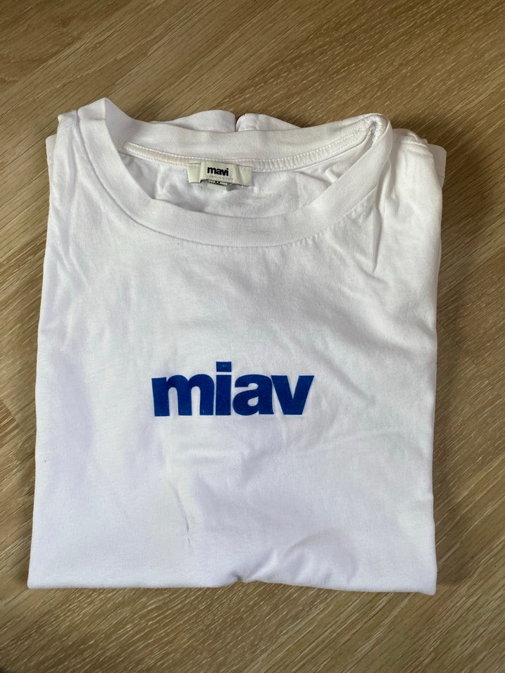 Kadınlar için beyaz pamuklu tişört, kısa kollu, bisiklet yaka ve 'miav' baskılı, rahat kesim, günlük sokak modasına uygun. Önünde minnak delikten dolayı bir dikiş vardr belli olmuyor görseldeki gibi