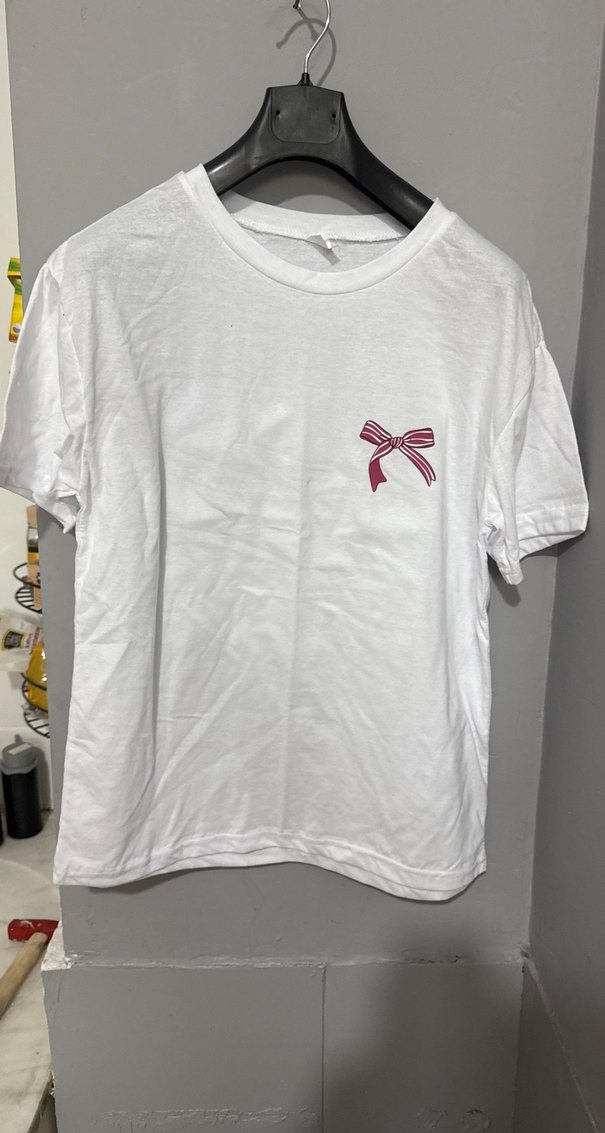 Pamuklu, beyaz kısa kollu tişört, göğüste küçük fiyonklu baskı detayıyla rahat kesim. Yuvarlak yakalı, günlük sokak stili için uygun.