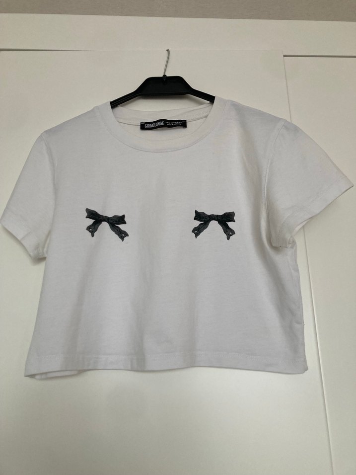 Beyaz pamuklu kısa kollu, bol kesim tişört; önünde siyah baskılı fiyonk detayları ve yuvarlak yaka bulunur.