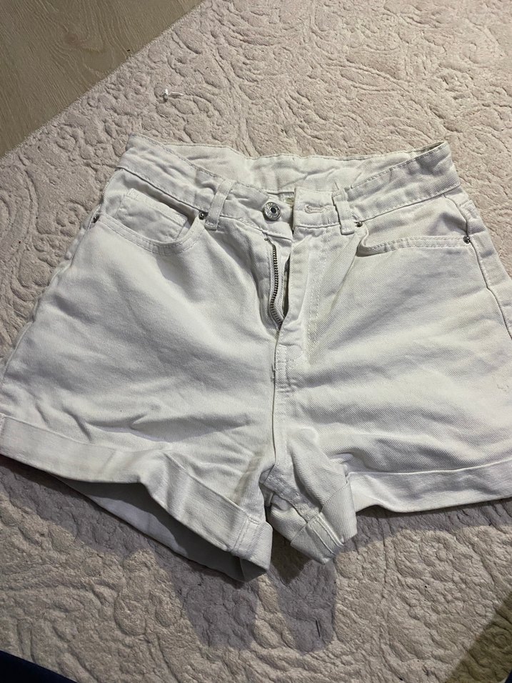 Beyaz pamuklu mini denim şort, rahat bir kesime sahip. Düz ve desensiz tasarımıyla günlük sokak stiline uygun, zahmetsiz şıklık sunar.