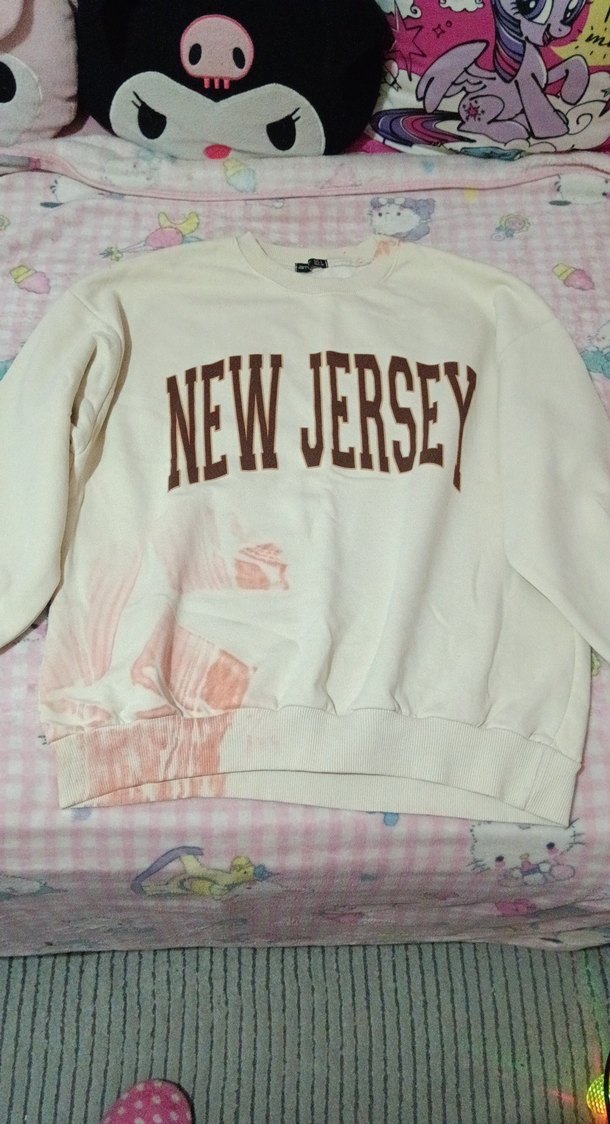 Pamuklu, uzun kollu, beyaz renkli ve bol kesim kadın sweatshirt. Önünde "NEW JERSEY" baskısı bulunur. Günlük kullanıma uygun rahat model. üstünde kırmızı boyalar mevcut.
