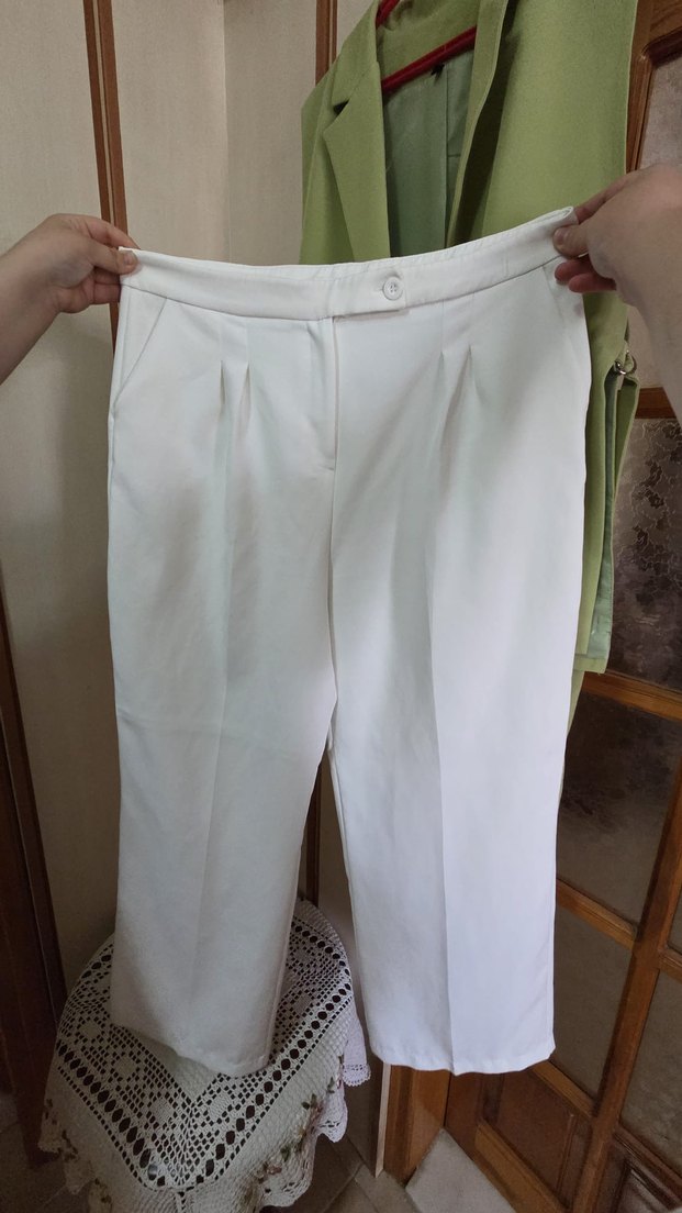 Beyaz kumaş pantolon wide leg boyu 105 cm bel 45 cm basen 60 cm bedeni 44 bir kez giyildi