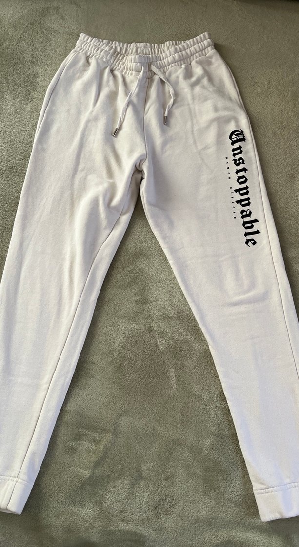 Midi boy, beyaz pamuklu, rahat kesim eşofman altı, 'Anstoppable' baskılı, günlük kullanıma uygun, zahmetsiz şıklık sunar. Ölçüleri resimlerde mevcuttur