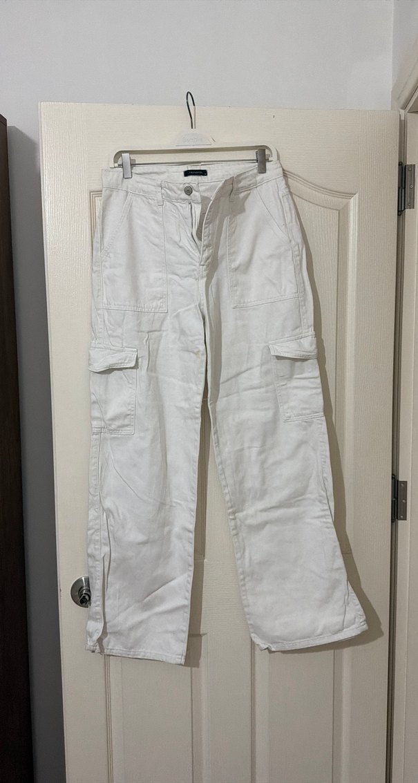 Bu beyaz pamuklu pantolonlar, midi boy ve rahat kesim olup gündelik şıklık için uygundur. Düz desensiz ve kullanışlı ceplidir, trend sokak stili için idealdir. Artık dar geliyor bu sebeple satıyorum Kücük bir lekesi var görsele koydum