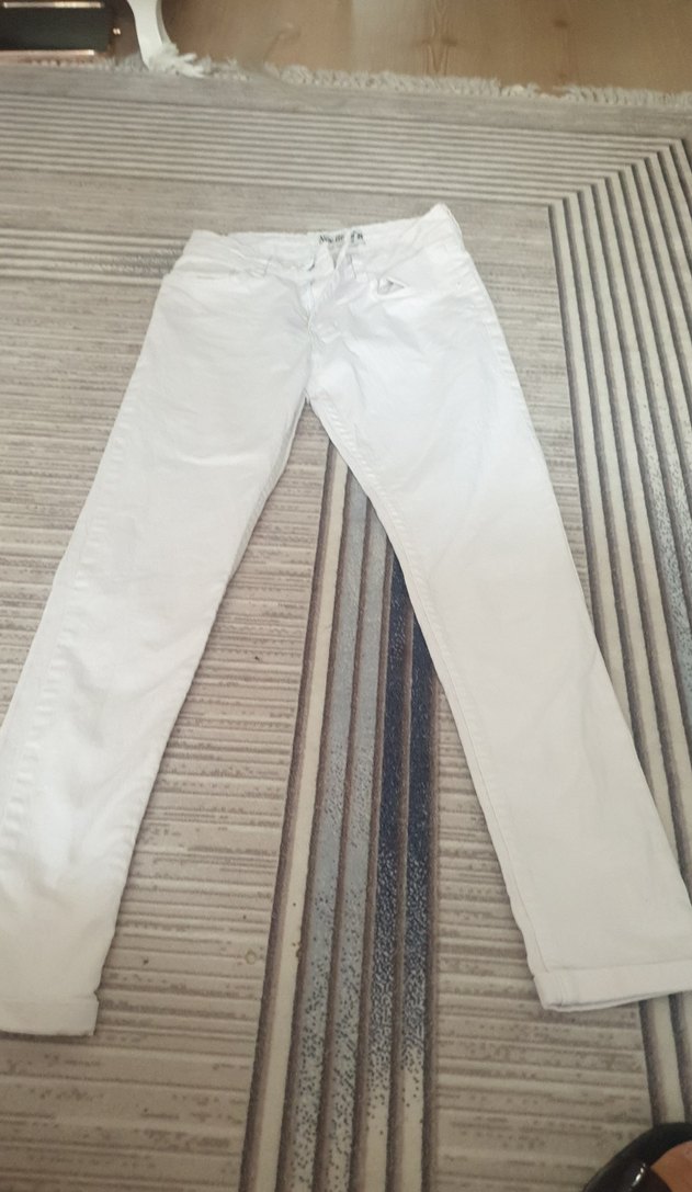 Kadınlar için beyaz pamuklu kumaştan yapılmış, regular fit ve normal boyda pantolon. Pilili ve desensiz tasarımıyla günlük kullanıma uygundur.