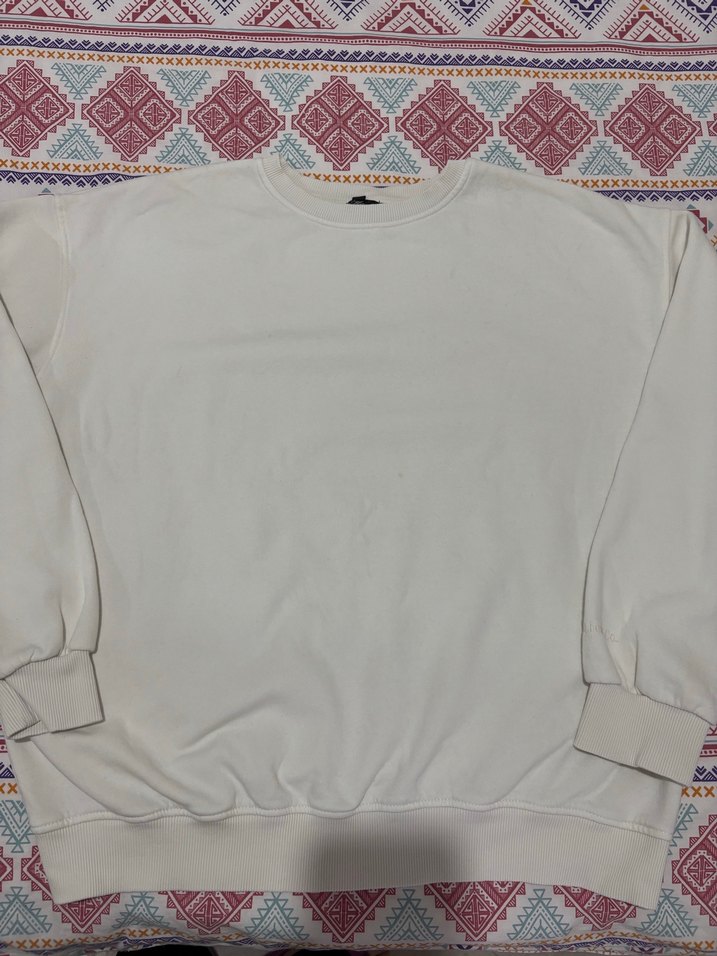 Uzun kollu, yuvarlak yakalı, pamuklu beyaz renkli kadın sweatshirtü, salaş kesimi ve rahat kullanımıyla günlük şıklık sunar.