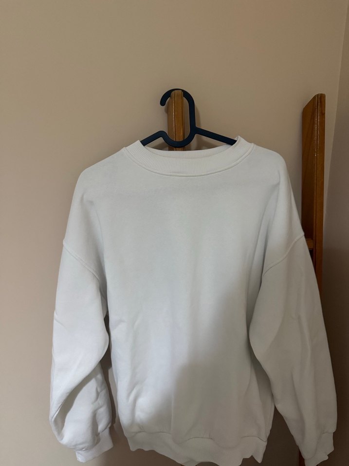Kadın beyaz sweatshirt, yuvarlak yaka ve uzun kollu, pamuklu kumaştan . Minimalist ve desensiz tarzıyla günlük rahat kullanıma uygundur.