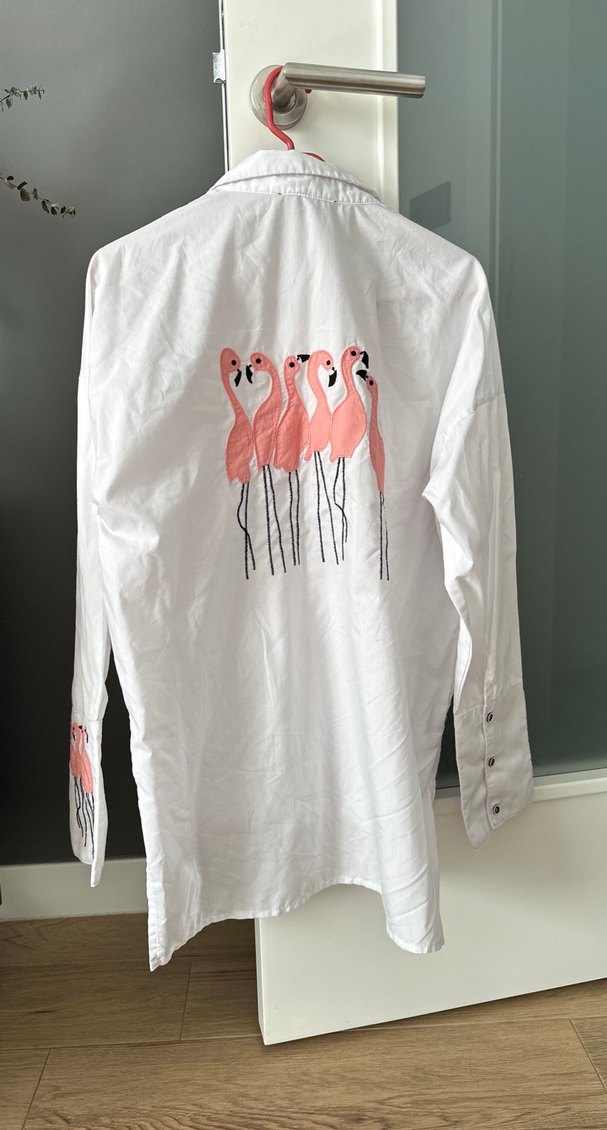 Beyaz pamuklu, uzun kollu, bol kesim kadın gömleği, sırt ve manşetlerde flamingo baskılıdır. Düğmeli ve normal boydadır, günlük kullanıma uygundur.
