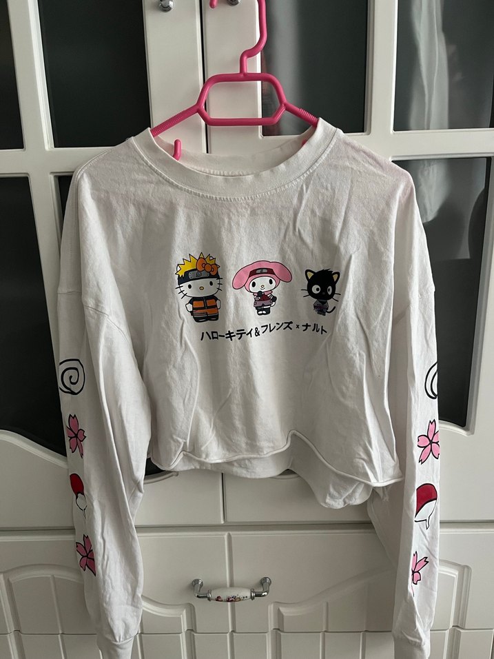 Pamuklu, beyaz, uzun kollu kadıb baskılı çizgi karakterler ve düğme detayları bulunur. Dar kesim ve bisiklet yaka tasarıma sahiptir.