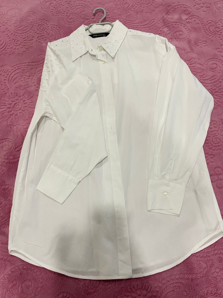 Beyaz pamuklu, yakalı ve düğmeli uzun kollu gömlek. Salaş kesimi ve normal midi boyu ile günlük rahat kullanıma uygundur. Hiç giyilmedi. Beden xs/s ancak m de rahat olur