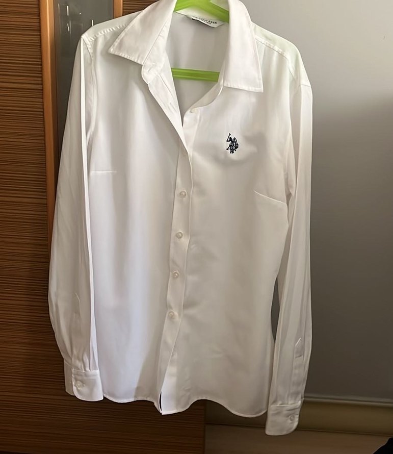 Beyaz pamuklu gömlek, uzun kollu ve kesik yaka detaylıdır. Düz kesim, düğmeli ve göğüste küçük nakışlıdır. Ofis ve günlük kullanım için uygundur.