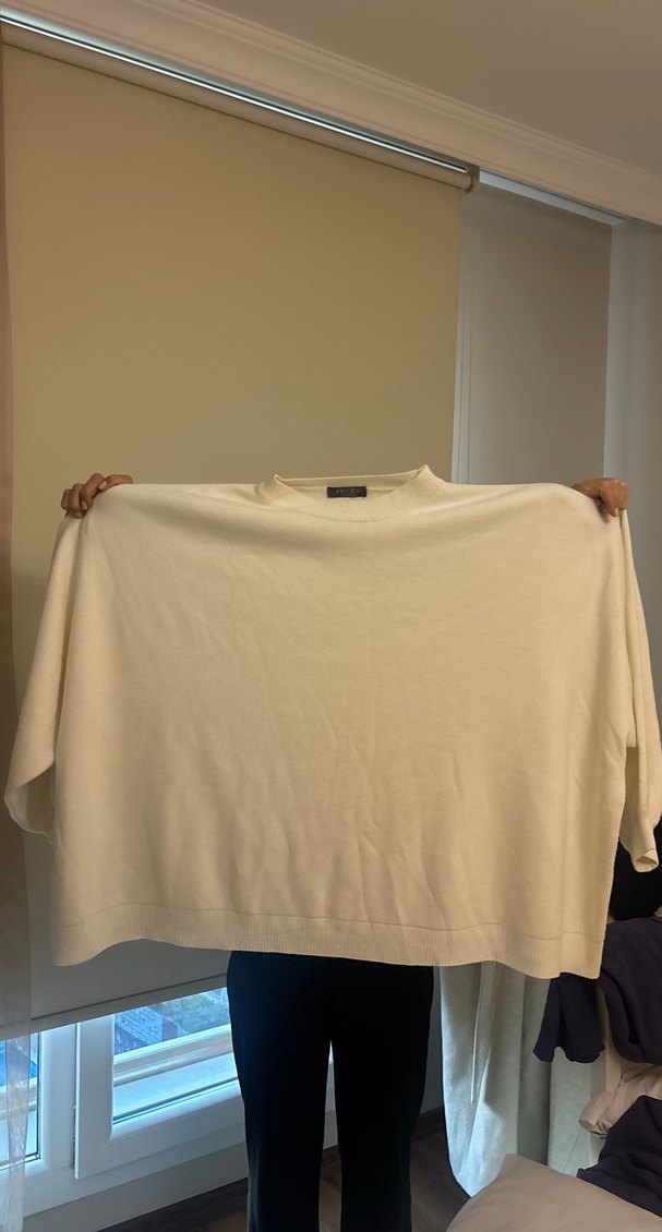 Beyaz pamuklu, kısa kollu, yuvarlak yakalı kadın sweatshirtü. Salaş ve normal boyda, günlük kullanım için minimal tarzda.