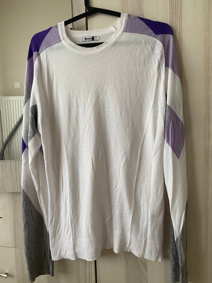 Kadınlar için uzun kollu ve yuvarlak yaka olan pamuklu, örgü dokulu triko. Salaş kesim, midi boy, kollarda gri ve mor detaylar bulunur. Günlük kullanım için uygundur.