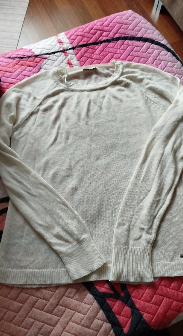 Beyaz pamuklu triko, uzun kollu ve yuvarlak yaka tasarıma sahiptir. Rahat, örme ve normal midi boydadır, günlük kullanıma uygundur.