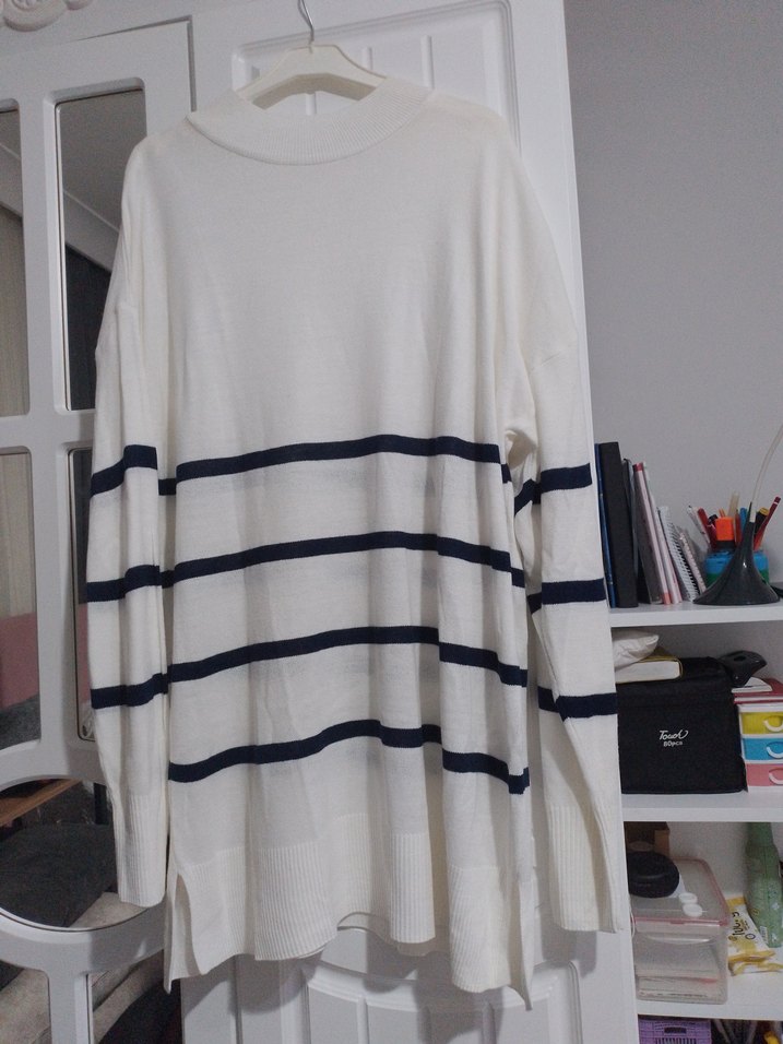 Beyaz pamuklu, uzun kollu, yuvarlak yaka ve bol kesim triko kazak. Örgü dokusu ve yatay lacivert çizgilerle rahat sokak stiline uygun. temiz ve sayılı kullanılmış asla sorunu olmayan ince ipten dokuma triko tunik #büyükbeden #geniskesim iki kol arası 65 cm boy 84 cm