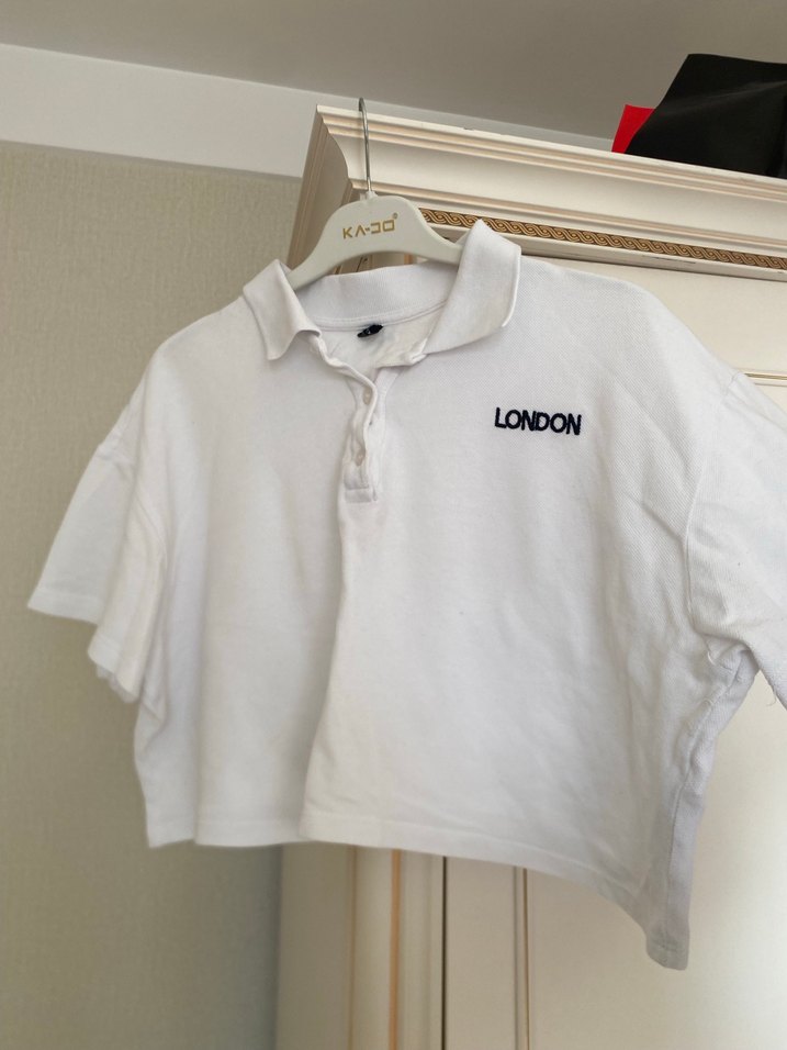 Kızlar için pamuklu, beyaz, kısa kollu, düğmeli yaka ve 'LONDON' baskılı rahat kesim polo tişört. Sokak stiline uygun.