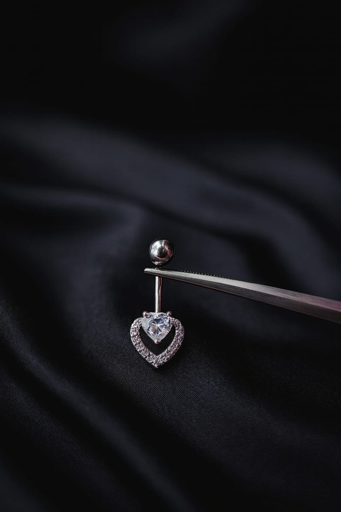 Kadınlar için beyaz, parlak taşlarla süslenmiş kalp şeklinde göbek piercingi. Klasik zarafeti yansıtan gotik tarzda tasarlanmıştır.