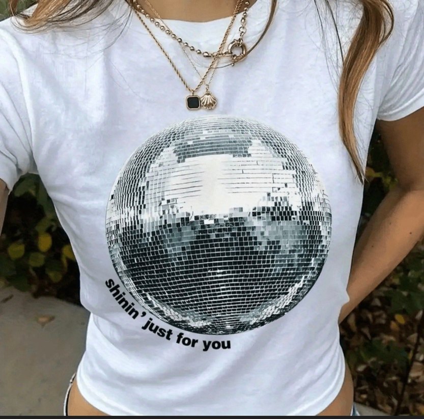 Kadınlar için beyaz, dar kesim, yuvarlak yaka ve kısa kollu tişört. Parlak payetli metal diskotek topu baskılı, parti ve sokak stili için uygun. ✨