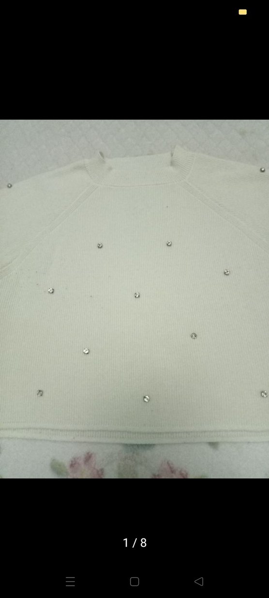 Kadınlar için beyaz, payet detaylı, yuvarlak yakalı ve uzun kollu, yumuşak ve sıcak kumaştan yapılmış bol kesim kazak. Dış mekan kullanımı için uygundur. ❄️