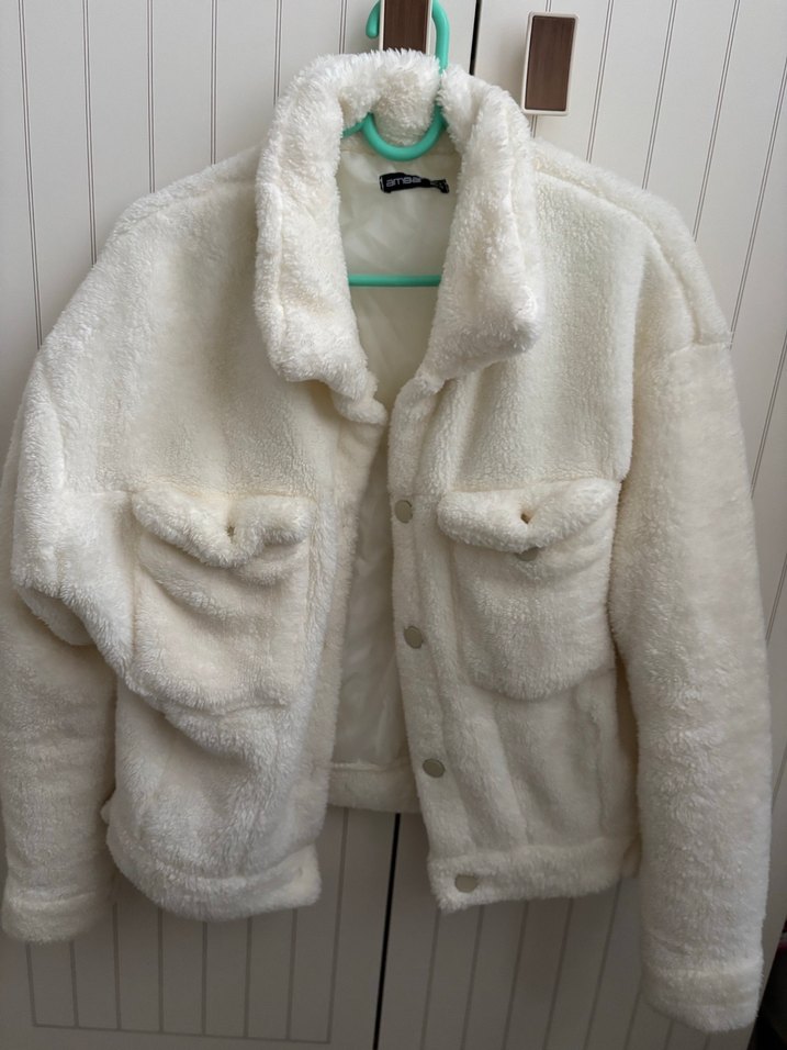 Beyaz, peluş ve kürk detaylı, uzun kollu, notalı yaka kadın ceket. Rahat kesimi ve normal boyuyla günlük sokak stiline uygun. Önde ceplidir.