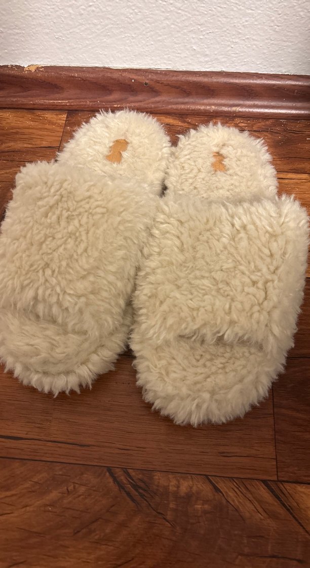 Kadın terlikleri yumuşak beyaz peluş ile kaplıdır, dolgu topuklu ve günlük kullanıma uygun sade bohem tarzda rahat bir üründür. Üzerinde sadece etiket yok