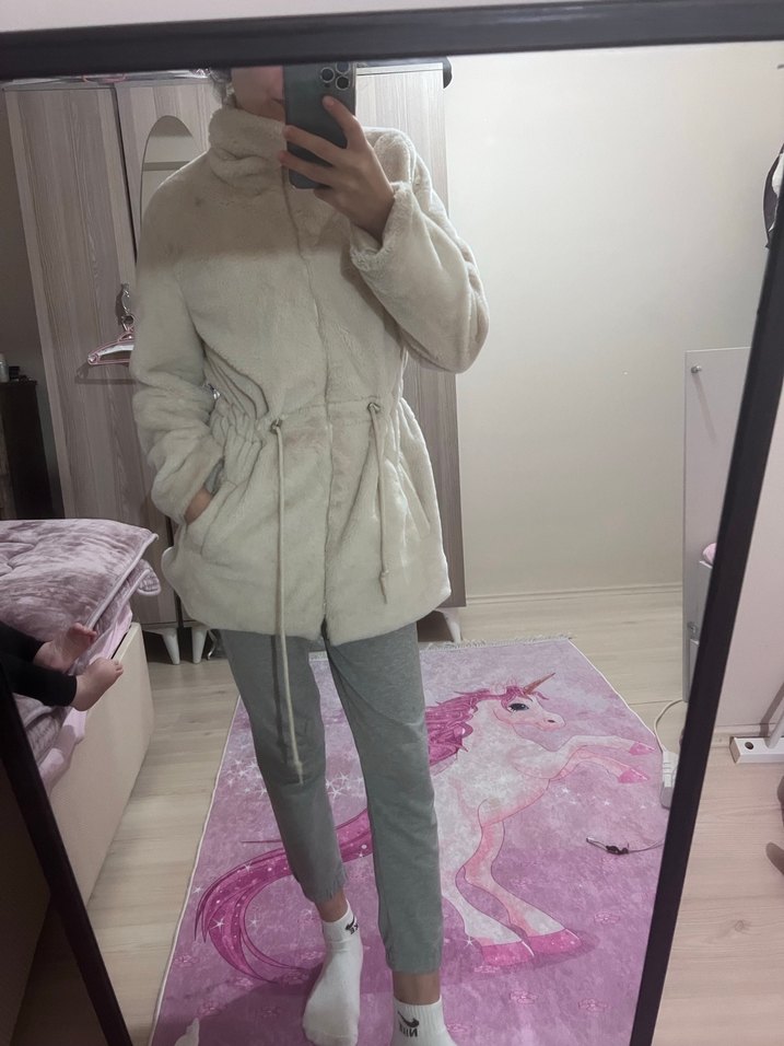 Kadınlar için yüksek yakalı, uzun kollu ve bol kesim midi boy beyaz peluş kaban. Kürk detayları ve ayarlanabilir bel bağcıkları bulunur, günlük kullanıma uygundur.