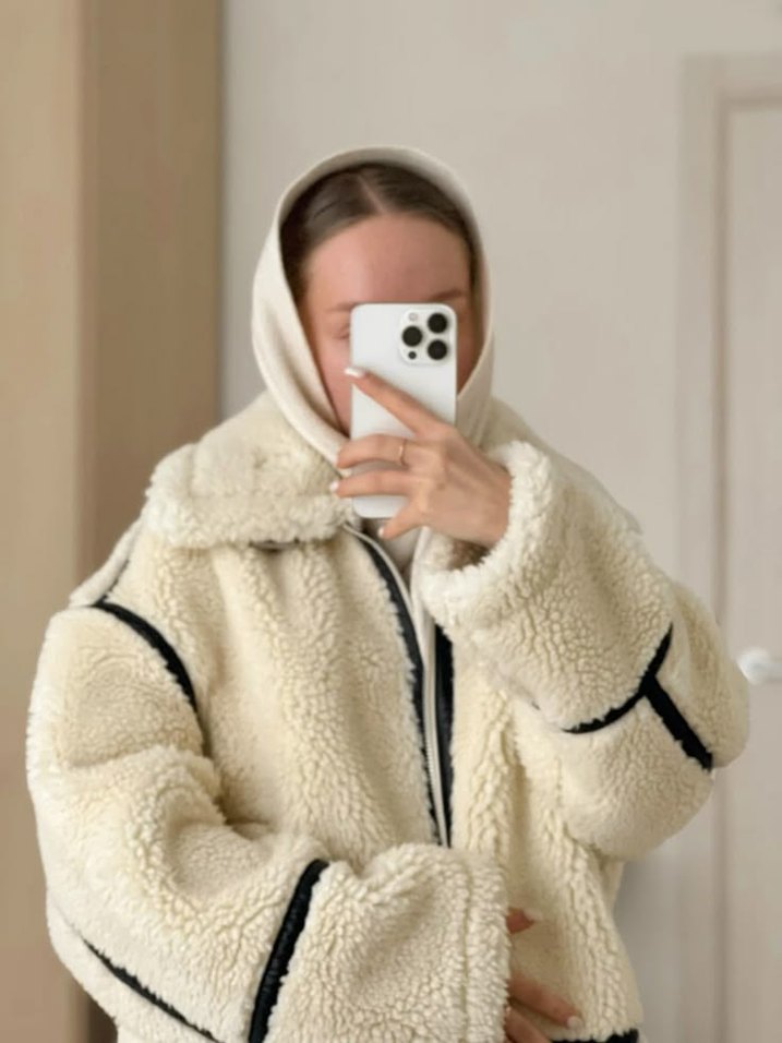 Beyaz peluş kumaştan, kapüşonlu ve bol kesim kaban, kürk detaylarıyla sıcak ve rahat bir sokak stili sunar. ❄️