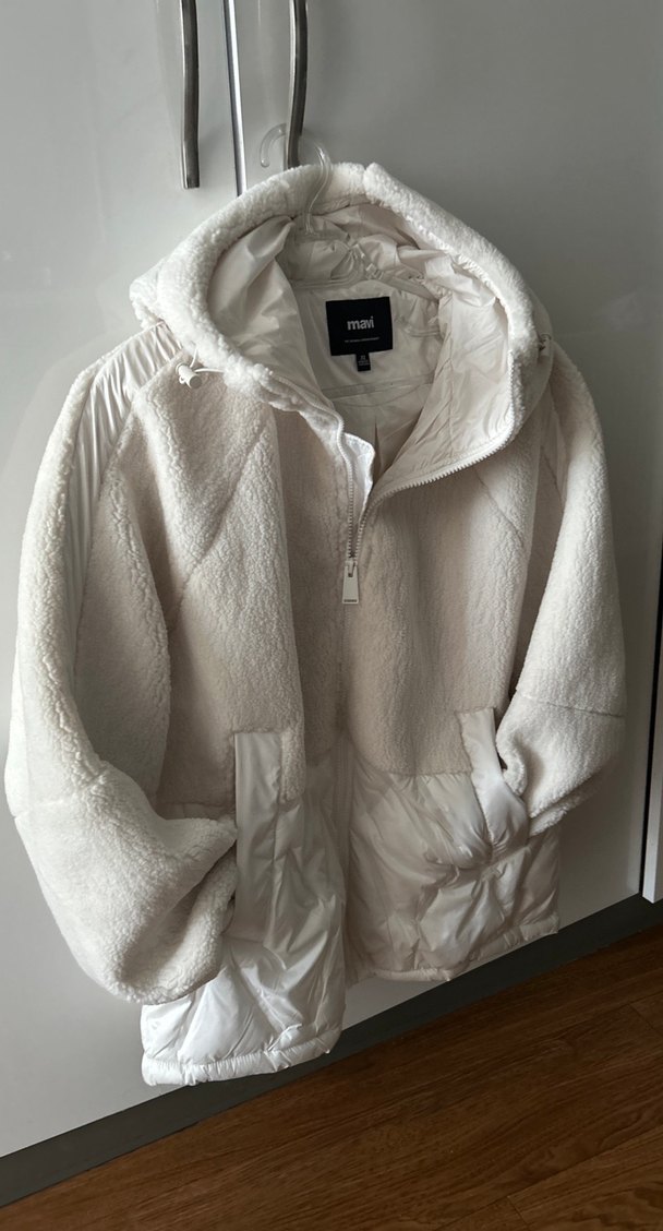 Kadınlar için bol kesim, yüksek yakalı ve uzun kollu beyaz peluş kışlık mont. Yumuşak kumaş ve kürk detaylı, günlük sokak stili için uygundur. ❄️