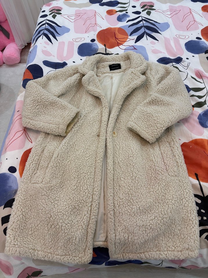 Kadınlar için yumuşak ve sıcak peluş kumaştan, kürk detaylı, düğmeli, notched lapel yakalı, uzun kollu, bol kesim midi uzunlukta krem kaban.