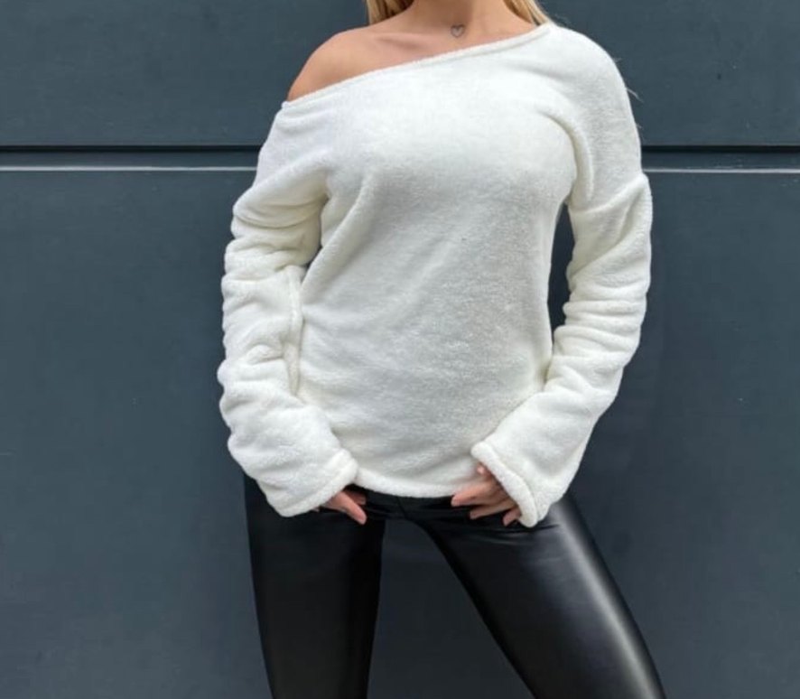 Beyaz, uzun kollu, yuvarlak yaka ve peluş detaylı salaş kesim kadın sweatshirt. Günlük kullanıma uygun rahat. Bedenleri mevcuttur