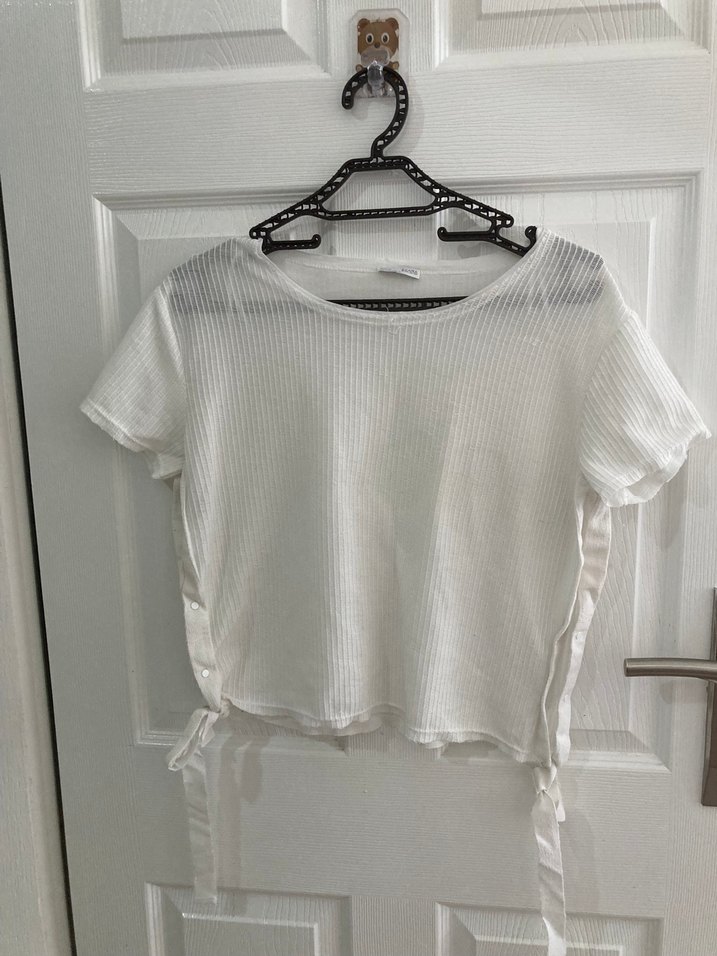 Bu beyaz crop top kısa kollu, yuvarlak yakalı ve pilili detaylıdır. Yumuşak kumaştan yapılmış, minimalist sokak stili için uygundur.