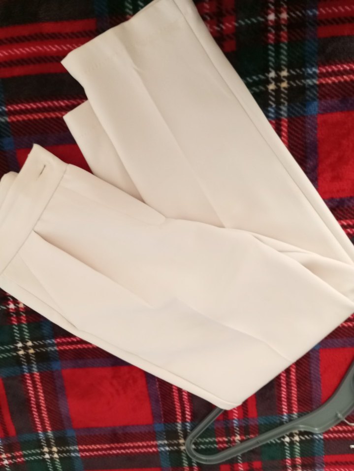 Kadınlar için beyaz kumaş pantolon, normal kesim, pilili ve midi boyda. Ofis kullanımı için uygun, klasik ve sade tarzda, sentetik kumaştan yapılmıştır.