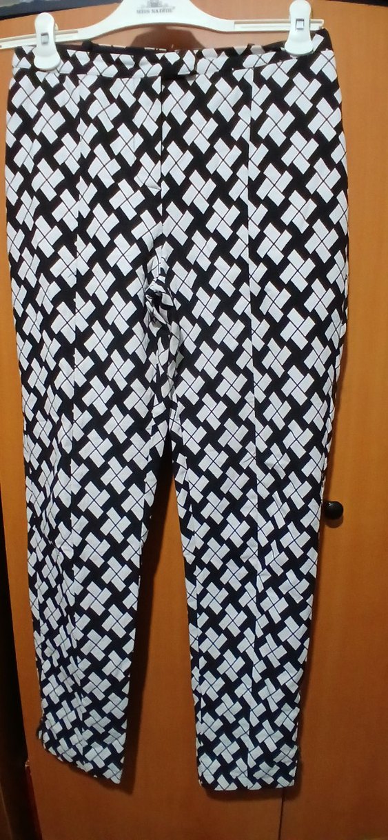 Pilili, midi boy, beyaz kumaş pantolon, dar kesim ve koyu geometrik desenli. Ofis ve sokak tarzına uygun. boy 100 cm