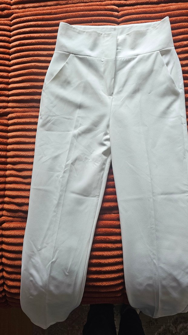 Kadın beyaz kumaş pantolon, normal boy ve regular fit. Piliseli detayları ve düz deseniyle iş ortamına uygun.tek sıkıntısı son fotoda oldugu gibi ufak bir elekisi vae yıkanırsa çıkar