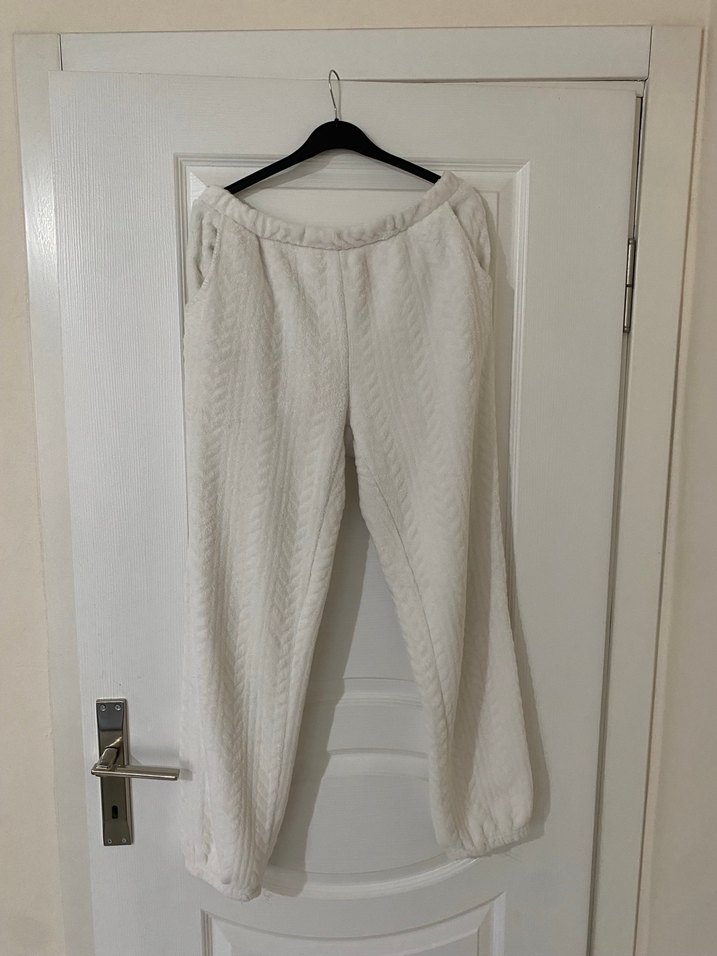 Yumuşak keten kumaştan, piliseli detaylı, bol kesim beyaz eşofman, günlük rahat kullanım için uygundur.