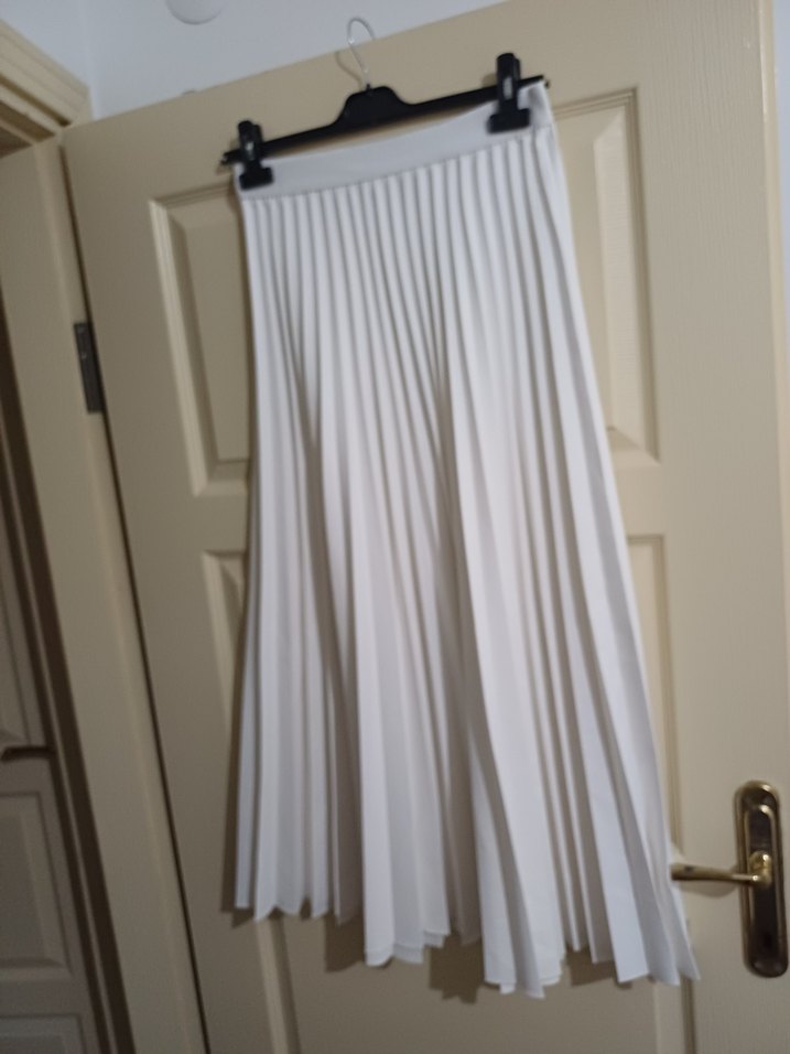 Beyaz renkte, piliseli ve düz kesim uzun etek desensiz 1 2 kez giyilsi yeni gibi trendyol fiyati 1400 tl dir