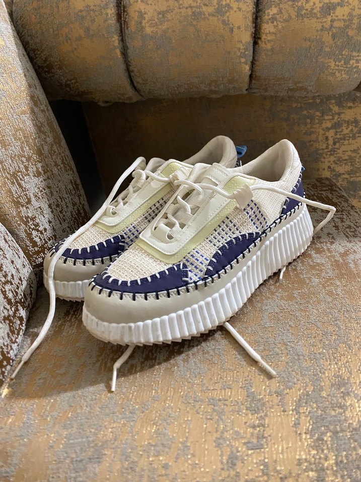Beyaz renkli kadın spor ayakkabısı, platform topuklu ve bağcıklı. Tie-dye desenli ve fırfır detaylı, kauçuk tabanlıdır.