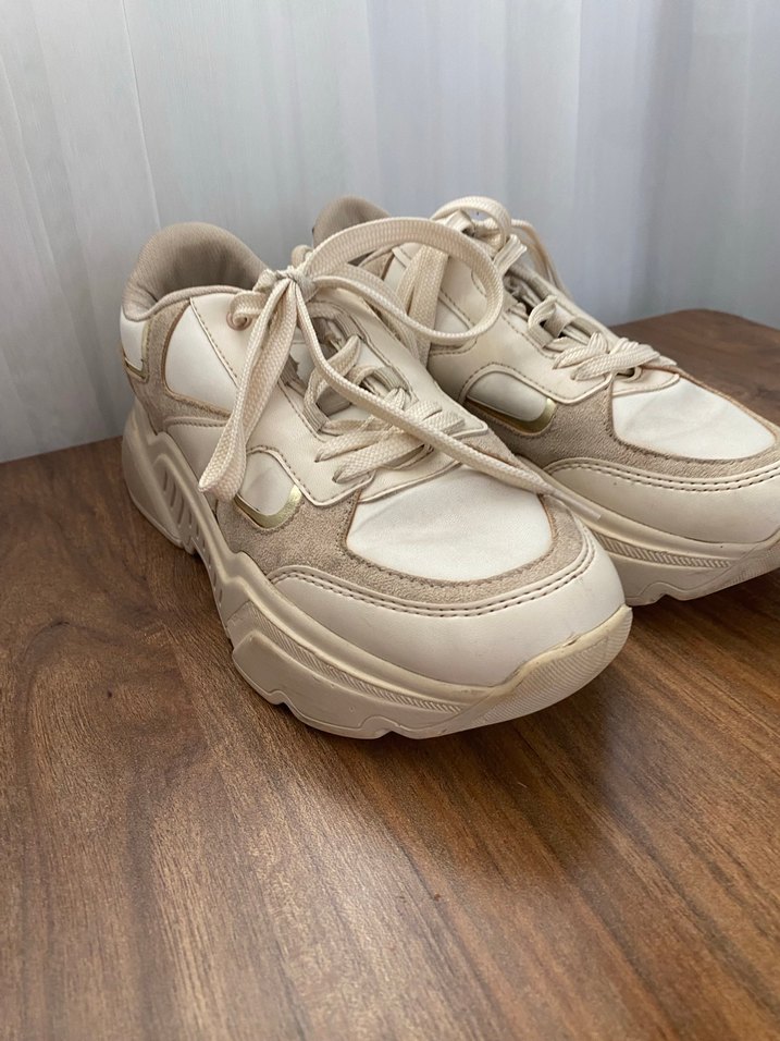Beyaz platform topuklu, bağcıklı ve kauçuk tabanlı spor ayakkabılar, pastel tonlarda trend rahat sokak stili için uygundur. Marka temsilidir