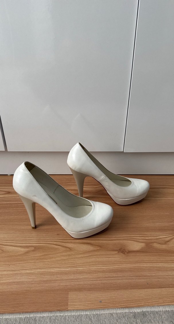 Beyaz platform topuklu kadın stiletto, minimalist ve modern klasik tasarıma sahiptir. Kauçuk malzemeden yapılmış, düğünler için zahmetsiz şıklık sunar. Desensiz ve zarif.