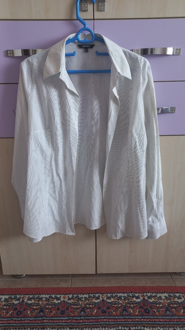 Beyaz keten, pliseli dokulu, uzun kollu, yakalı ve bol kesim kadın gömleği. Ofis ve günlük kullanıma uygun, minimalist tarzda.