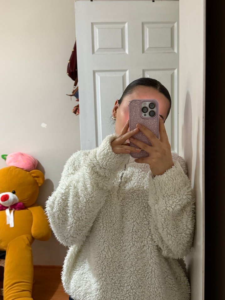 Kadınlar için beyaz, pofuduk ve yumuşak dokulu, yüksek yakalı uzun kollu mont. Bol kesim ve normal boyda, rahat ve günlük kullanım için uygun. ❄️